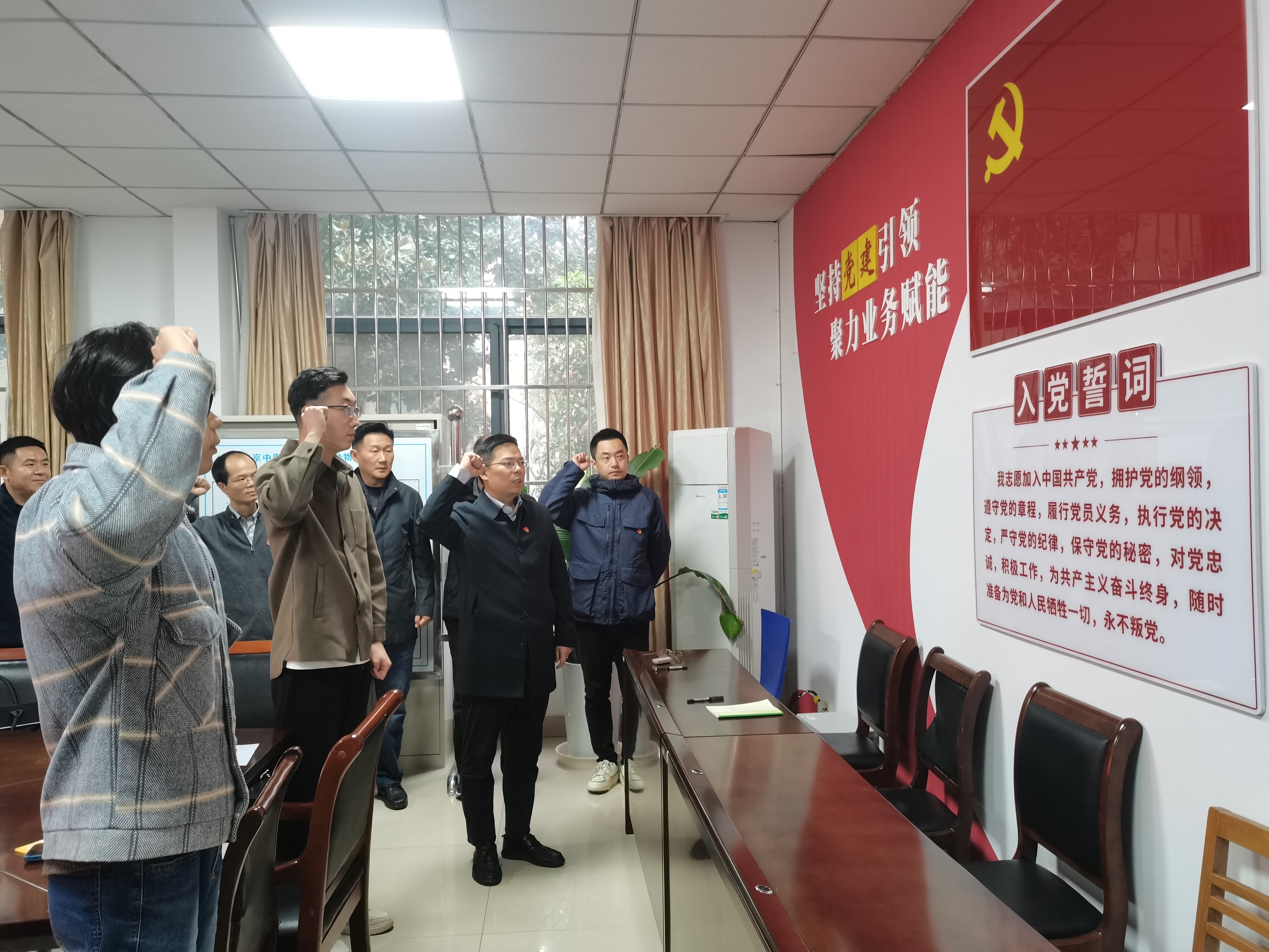 谢波书记带领两名新同志面对党旗进行入党宣誓仪式
